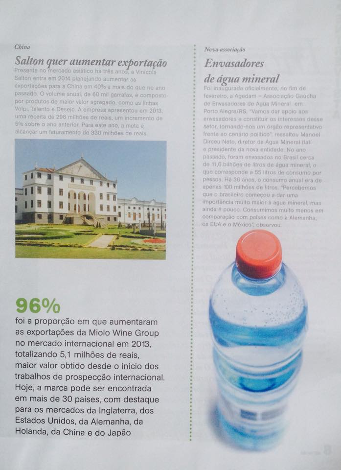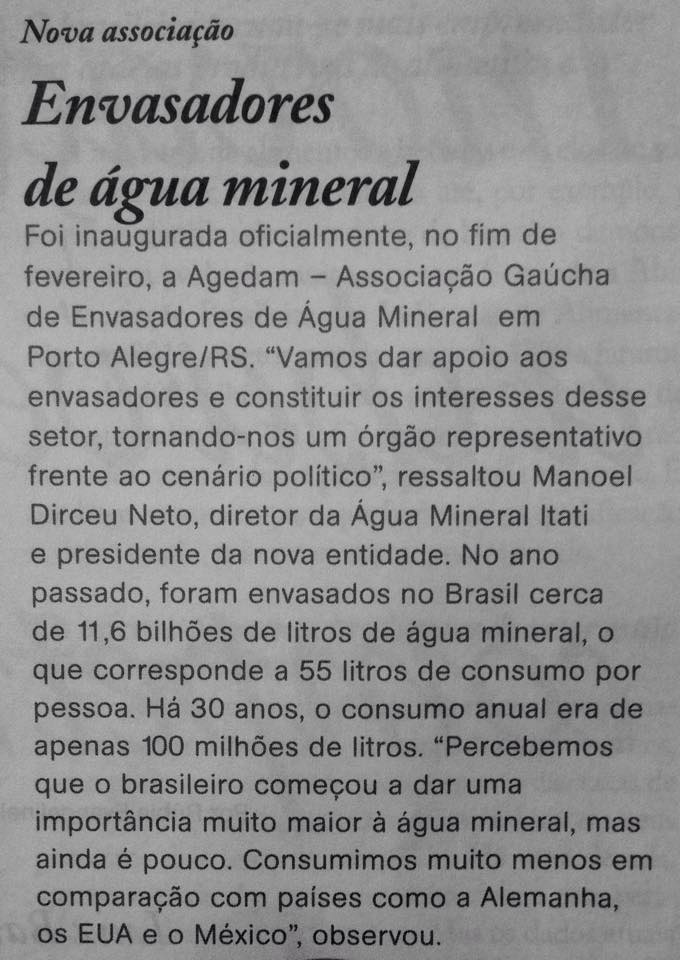 Foi criada oficialmente, em Porto Alegre, a Associação Gaúcha de Envasadores de Água Mineral (Agedam), que tem na presidência Manoel Dirceu Neto, diretor da água mineral Itati. Vem em boa hora. Em 2013, foram envasados cerca de 11,6 bilhões de litros, o que corresponde a 55 litros per capita. Há 30 anos, o consumo era de apenas 100 milhões de litros. A entidade vai ter um conselho de ética e obrigatoriedade de selo de qualidade. É uma ótima notícia.
